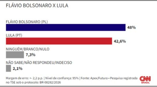 PESQUISA FUTURA/APEX Flávio teria 48% contra 42,6% de Lula, que lidera rejeição, numa disputa de 2º turno, traz CNN