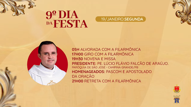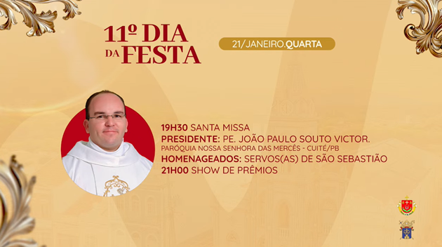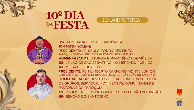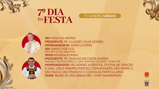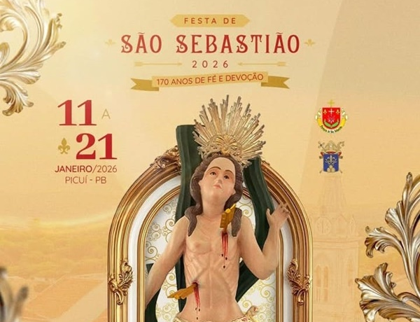 No final da tarde deste domingo (21), a Paróquia de Picuí anunciou oficialmente a programação religiosa da Festa de São Sebastião, padroeiro do município, que será realizada entre os dias 11 e 21 de janeiro de 2026.