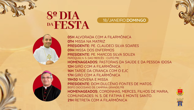 Durante o período festivo, de 11 a 21 de janeiro, a comunidade católica de Picuí e cidades vizinhas é convidada a participar de toda a programação religiosa em homenagem ao padroeiro.
