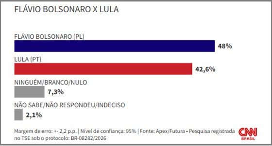 Segundo os dados da pesquisas, divulgada pela CNN, o senador Flávio Bolsonaro (PL) venceria o presidente Lula num eventual segundo turno, com o percentual de 48% contra 42,6% para o petista.