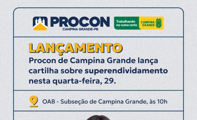 Com o objetivo de oferecer suporte educativo e jurídico aos consumidores que enfrentam dificuldades financeiras extremas, o Procon de Campina Grande lança nesta quarta-feira (29), a sua Cartilha Contra o Superendividamento. O evento de lançamento acontecerá no auditório da seccional da OAB em Campina Grande, no bairro do Catolé, das 10h às 12h, e reunirá especialistas, autoridades e a sociedade civil para discutir estratégias de proteção ao crédito e de educação financeira.